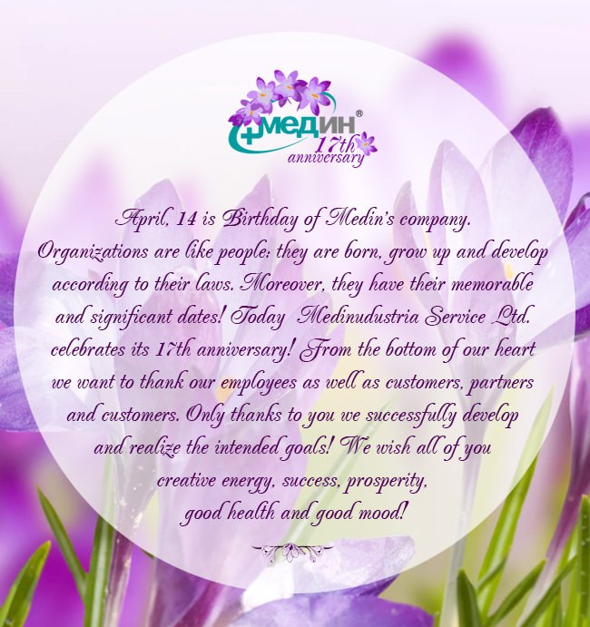 April, 14 is Birthday of Medin’s company. Organizations are like people: they are born, grow up and develop according to their laws. Moreover, they have their memorable and significant dates! Today Medinudustria Service Ltd. celebrates its 17th anniversary! From the bottom of our heart we want to thank our employees as well as customers, partners and customers. Only thanks to you we successfully develop and realize the intended goals! We wish all of you creative energy, success, prosperity, good health and good mood!