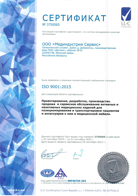 ООО «Мединдустрия Сервис» с 4-5 сентября прошло сертификационный аудит и получило сертификат на соответствие системы менеджмента качества ООО «Мединдустрия Сервис» требованиям международных стандартов ISO 9001:2016 и ISO 13485:2016 у Органа по сертификации «LL-C Certification» (Чешская Республика) – члена международного форума по аккредитации органов по сертификации IAF.