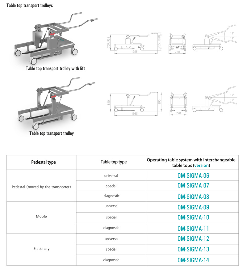 Operating table OM-SIGMA, which is a system of interchangeable tabletops and transporters, ensures sterility in the operating theatres, saves time while preparing the patient for the surgery and significantly increases throughput. This model allows you to transport the patient within the operating theatre, excluding the stage of transferring him to a hospital gurney. It reduces the risk of injury to the patient after complex operations.