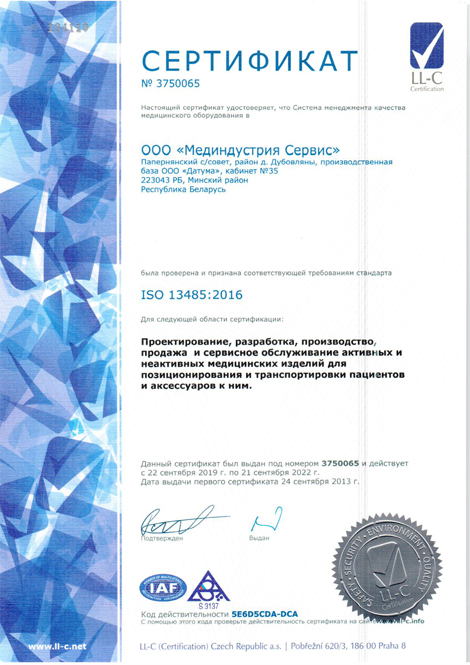 ООО «Мединдустрия Сервис» с 4-5 сентября прошло сертификационный аудит и получило сертификат на соответствие системы менеджмента качества ООО «Мединдустрия Сервис» требованиям международных стандартов ISO 9001:2016 и ISO 13485:2016 у Органа по сертификации «LL-C Certification» (Чешская Республика) – члена международного форума по аккредитации органов по сертификации IAF.
