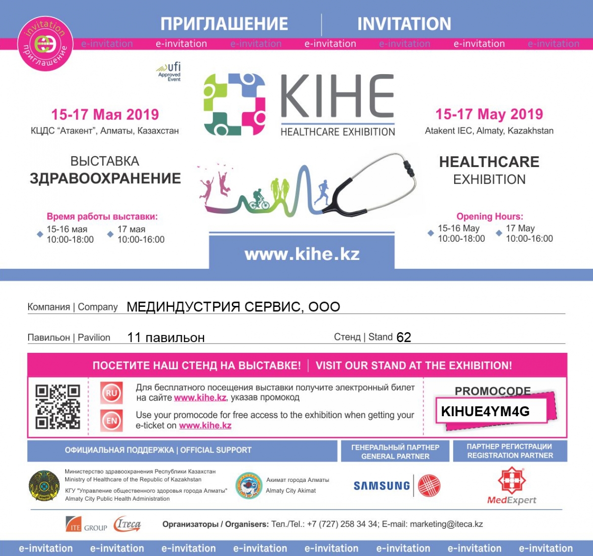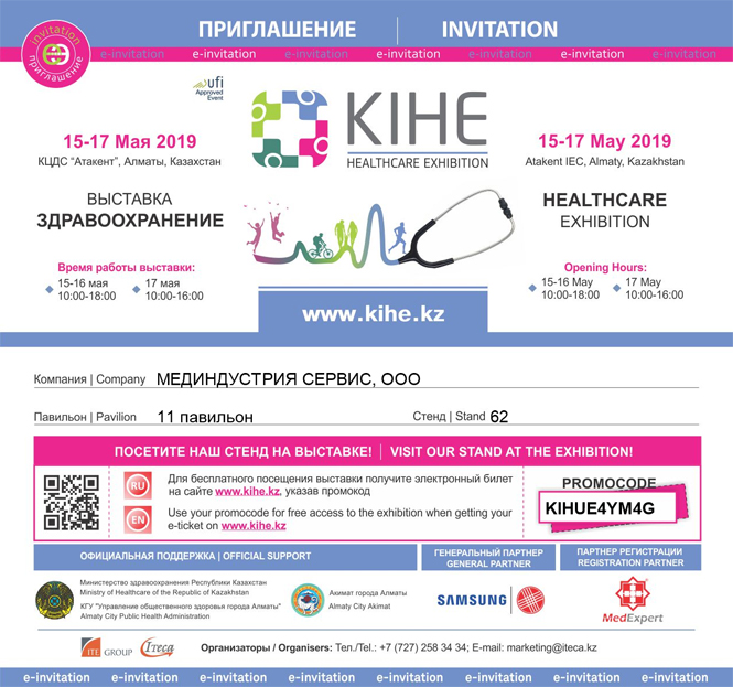 В текущем году на Казахстанской Международной выставке «Здравоохранение» - KIHE, в Алматы, в период с15 мая по 17 мая мы будем готовы презентовать последние инженерные достижения в области хирургии, акушерства и гинекологии. Мы широко раскрываем наши двери и приглашаем вас для обсуждения любых бизнес-идей и вывода нашего партнерства на качественно новые уровни.